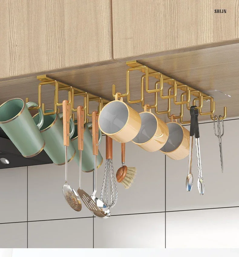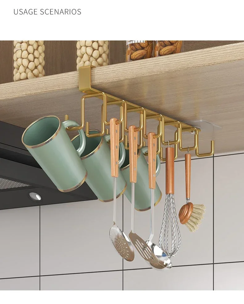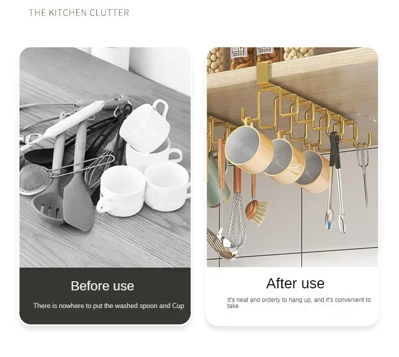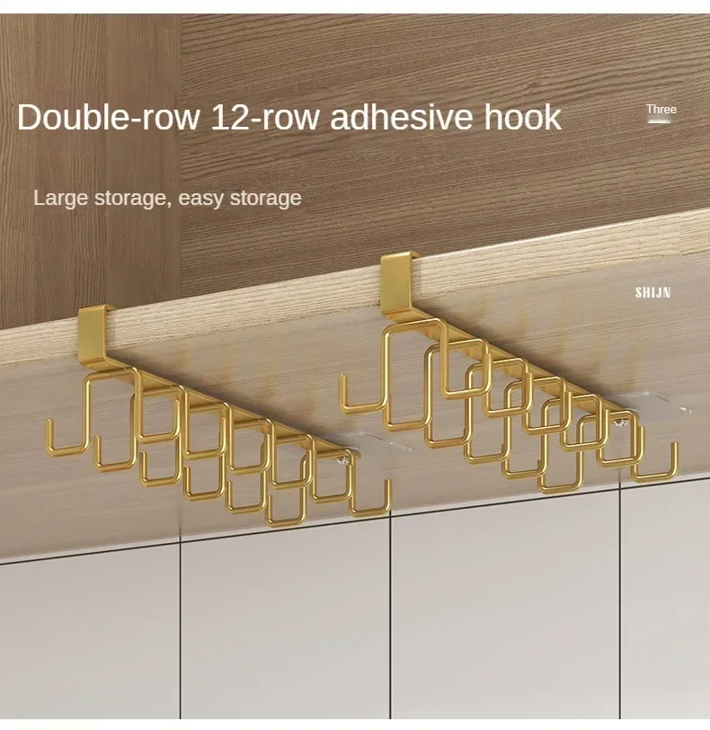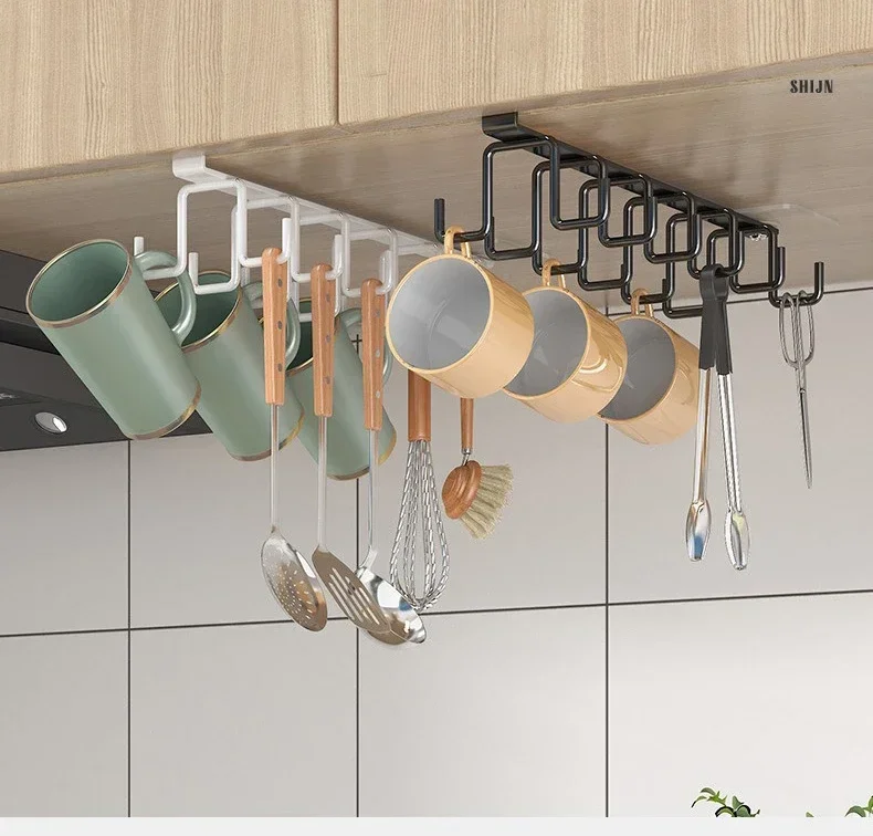 Double-row Hooks Punch-free Kitchen Cupboard Under Shelf Mug Cup Hanger Hook Iron Hanging Rack Holder Kitchen Cabinet Organizer