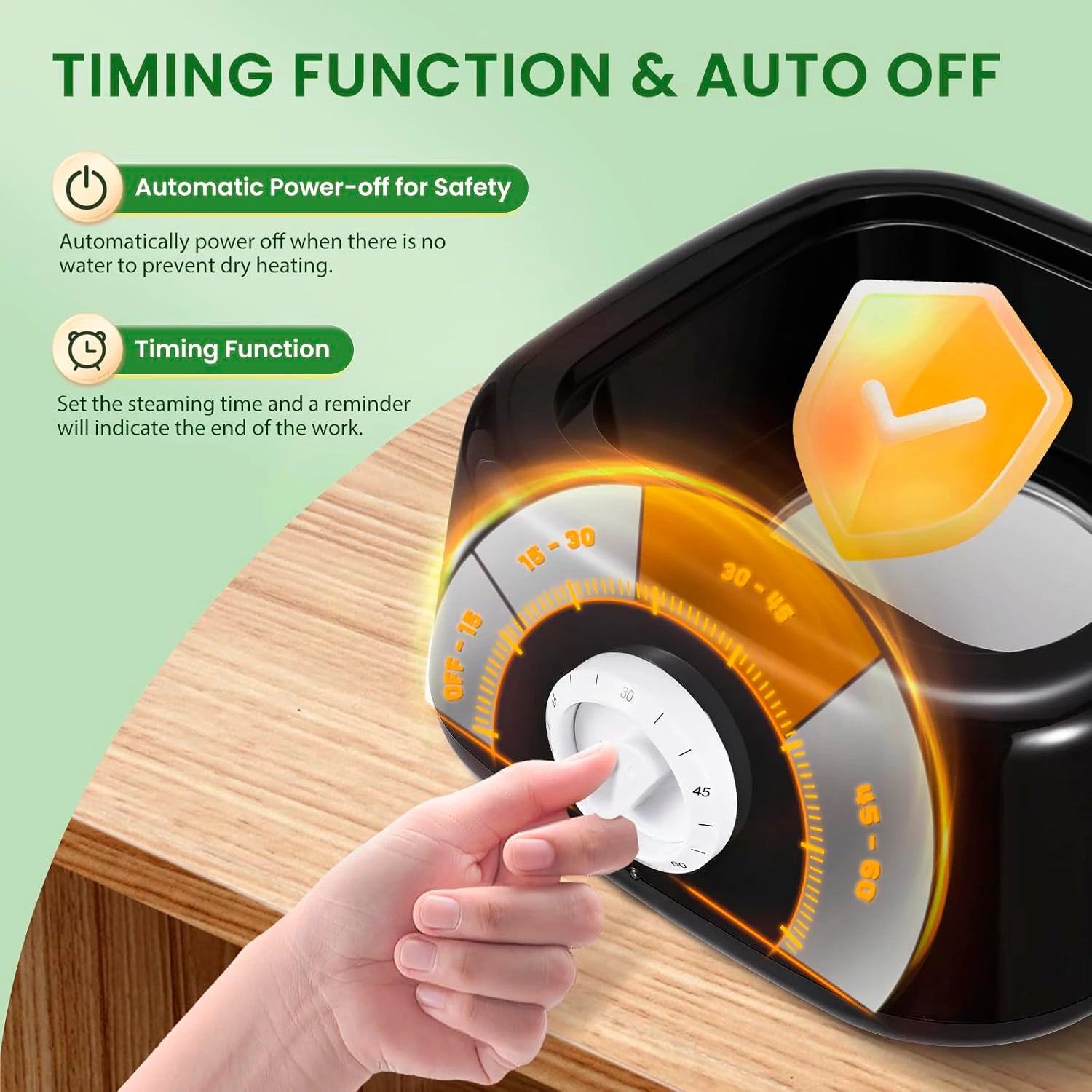 • Timer Function: Set steam time in advance; automatically shuts off when water runs out.