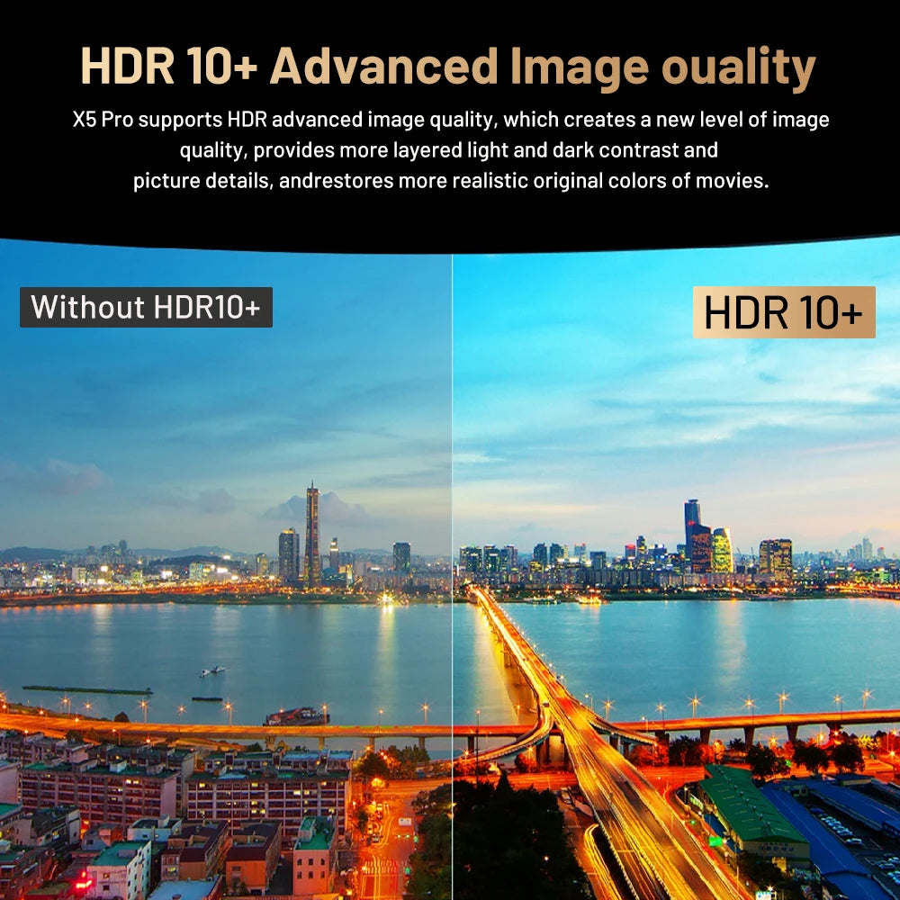 X5 Pro supports HDR advanced image quality, which creates a new level of image quality, provides more layered light and dark contrast and picture details, and restores more realistic original colors of movies