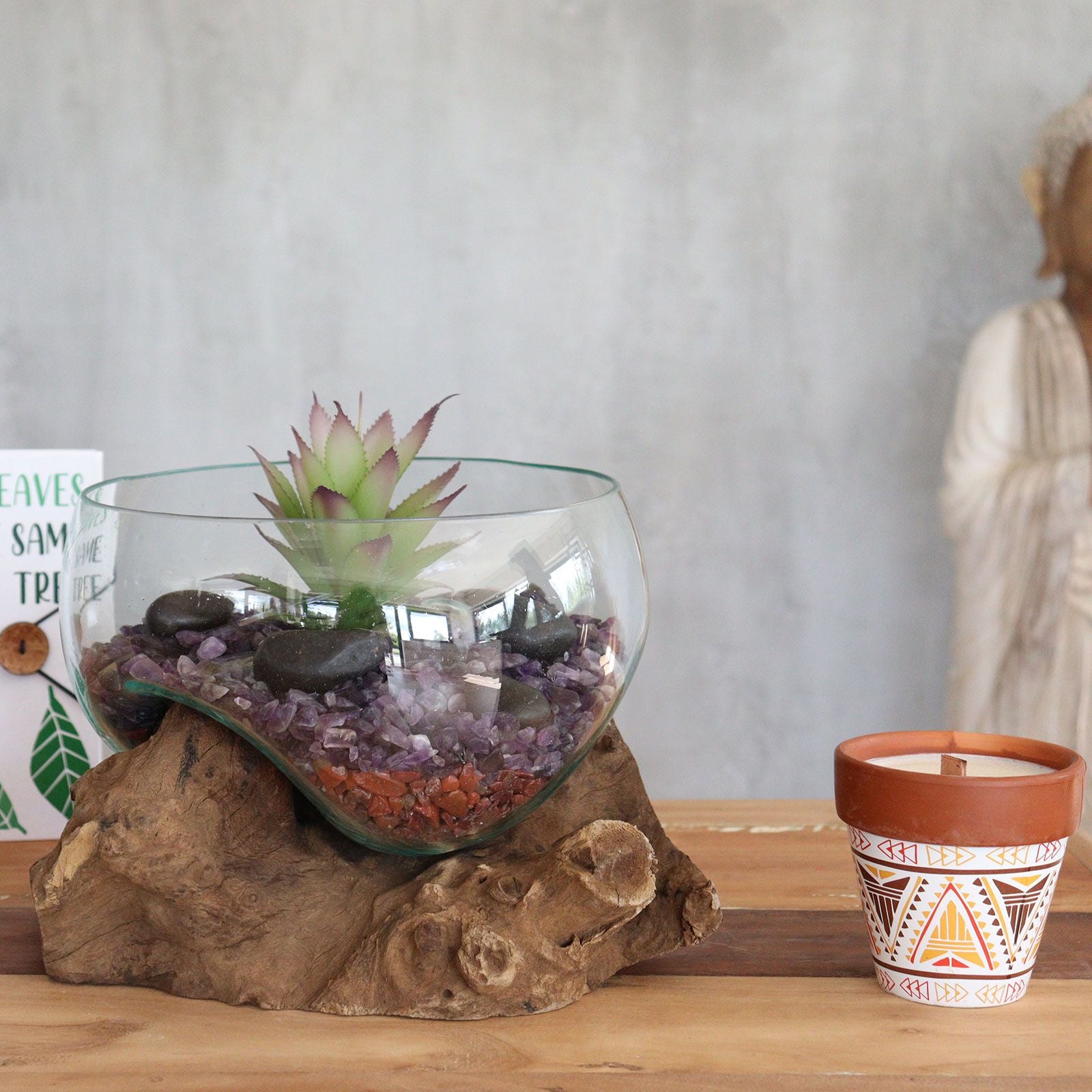 Our handmade melted glass on Wood is probably the biggest thing out of Bali in years, in Holland already a massive trend. Everything house plant related and natural is a major trend, and this beautiful and natural product is right on the button. They are crafted by hand in Bali from recycled glass and Balinese Gamal wood for AWGifts - Dropshipping. This stunning, molten art glass vase brings the best of two worlds together: natural and man-made; earthy and chic; practical and spiritual.