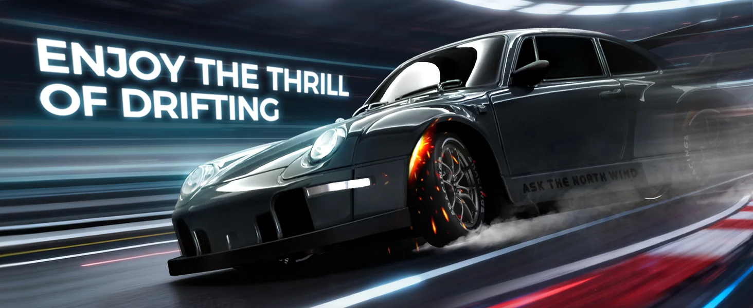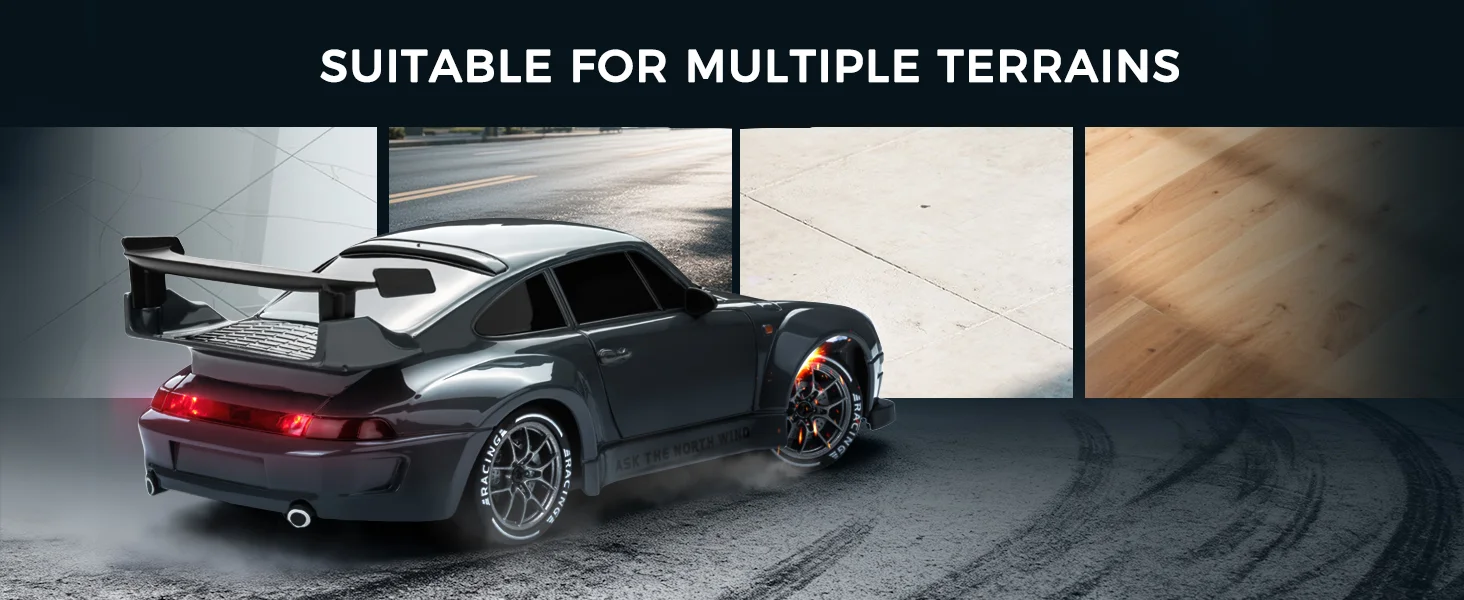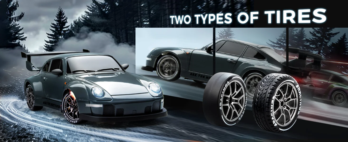 Dual-Mode Racing Experience: Includes 4 drift tires and 4 racing tires with a quick release mechanism for rapid swaps. Drift tires excel on smooth surfaces (wood, tile, tracks) for controlled slides, while racing tires offer superior traction on rough outdoor terrain. Tip: Switch to racing tires on uneven surfaces for optimal control.