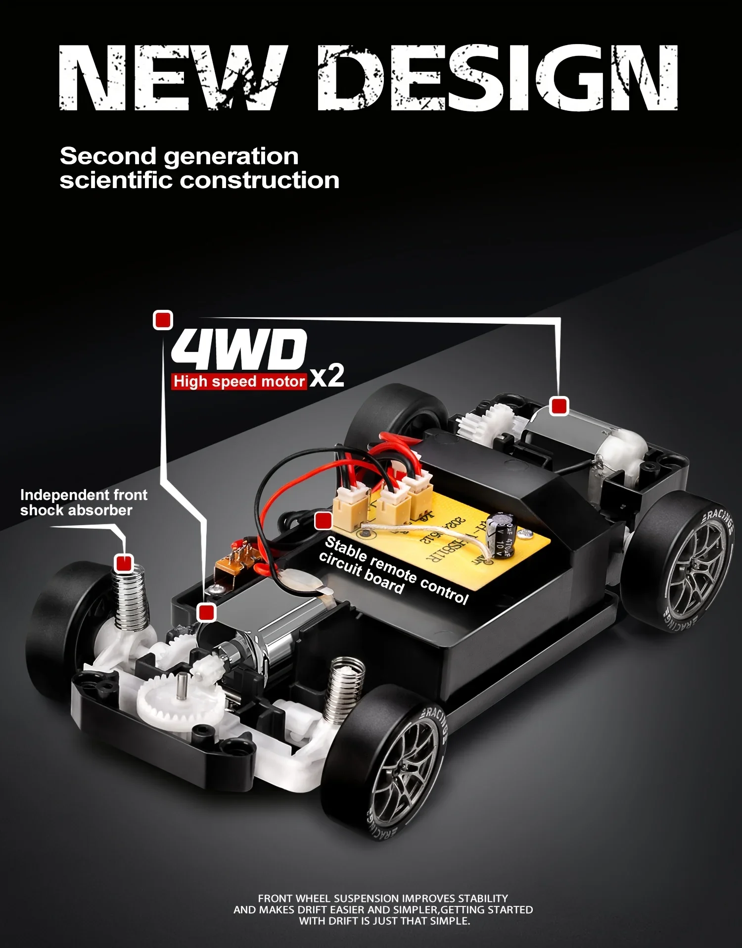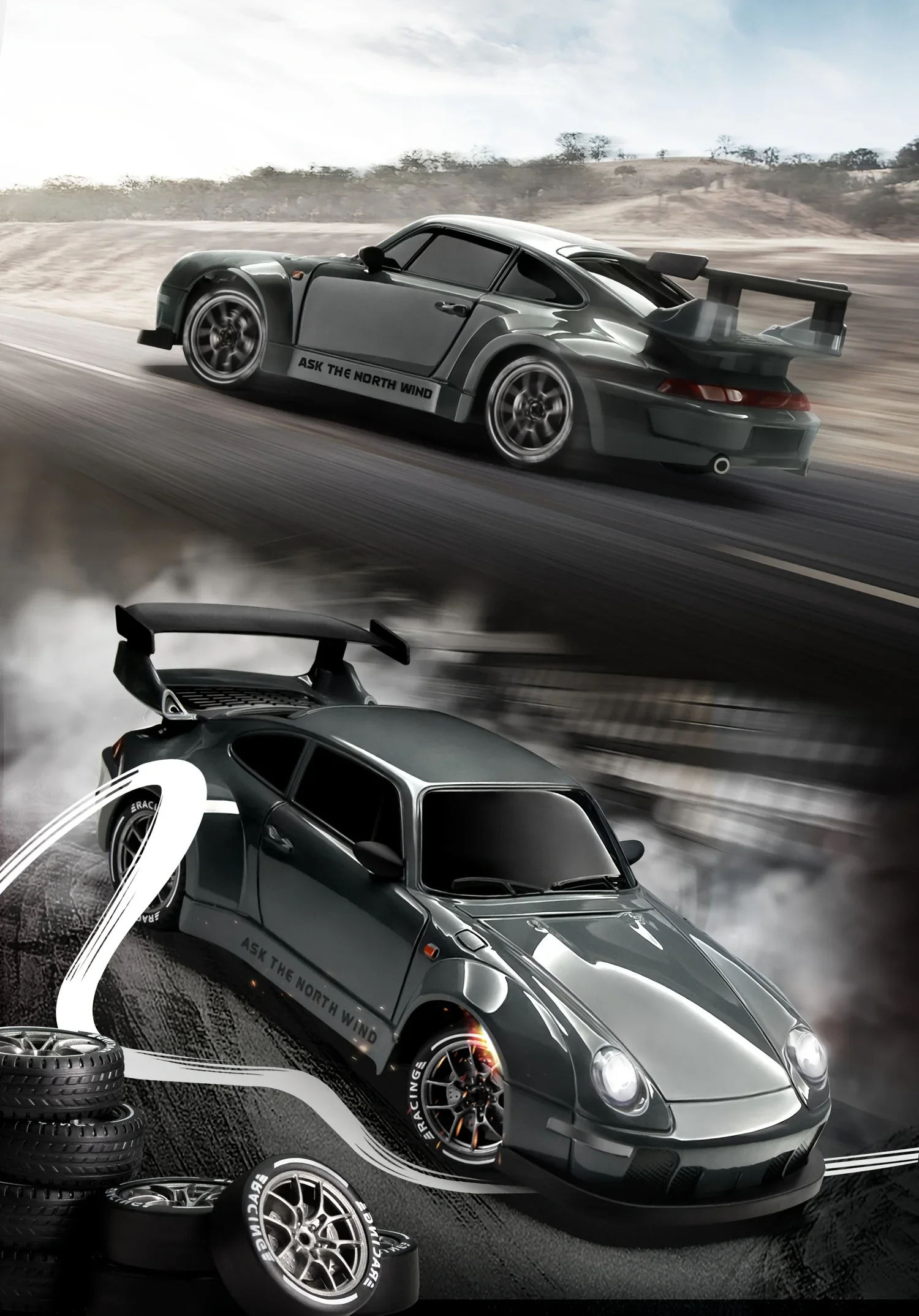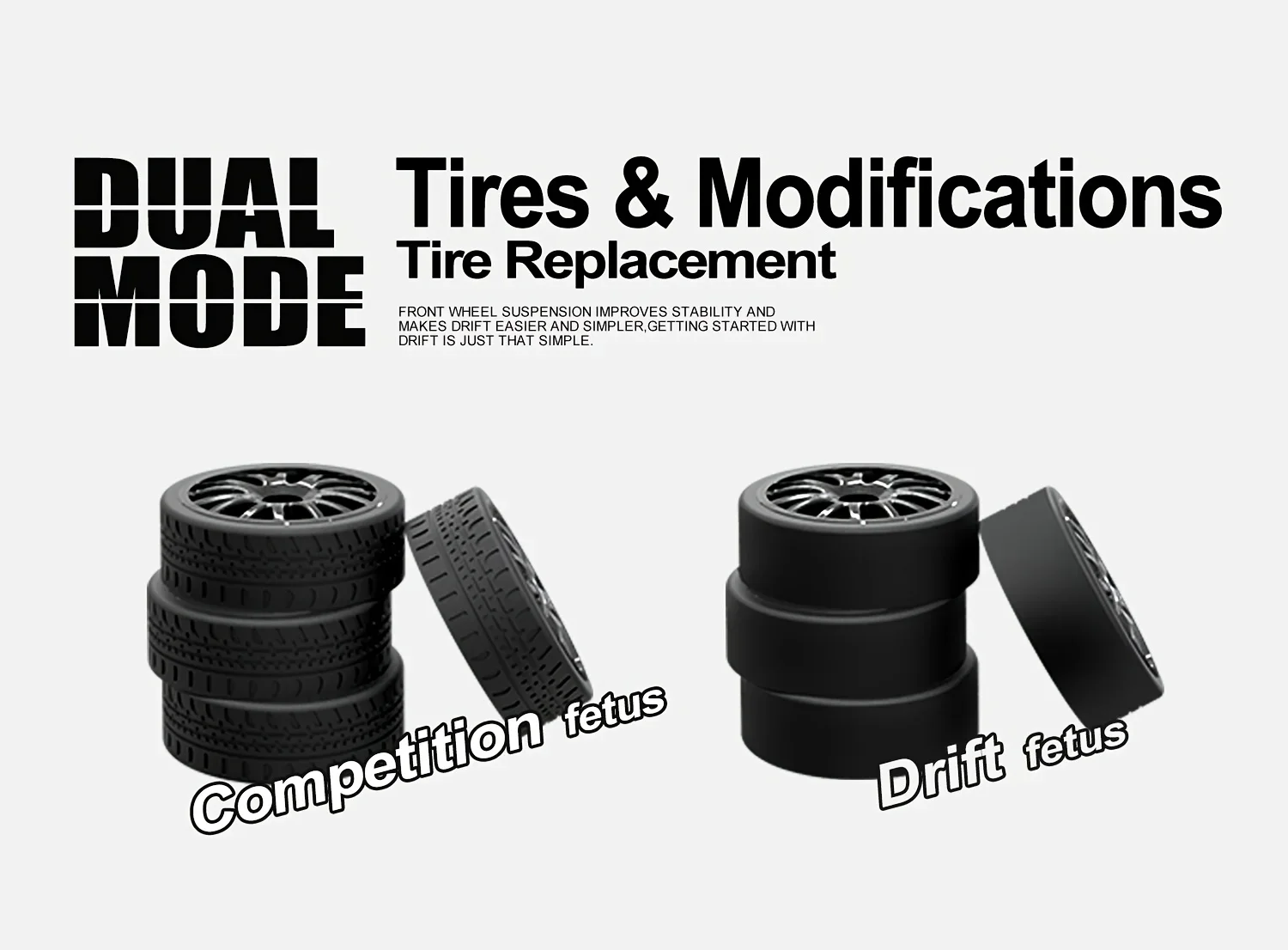 Dual-Mode Racing Experience: Includes 4 drift tires and 4 racing tires with a quick release mechanism for rapid swaps. Drift tires excel on smooth surfaces (wood, tile, tracks) for controlled slides, while racing tires offer superior traction on rough outdoor terrain. Tip: Switch to racing tires on uneven surfaces for optimal control.
