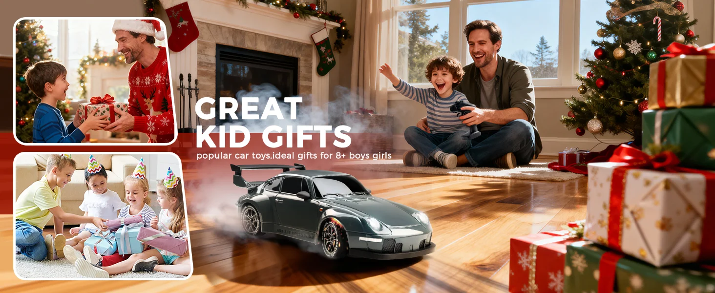 Perfect Gift Choice: Blending competitive thrills with collectible appeal, this 4WD drift car features aerodynamic styling and dynamic lighting for gallery worthy display. Its adaptive 4WD system and dual mode tires enable seamless transition between drift stunts and off-road racing. CE with collision-resistant construction for safe use by ages 6+. Includes buildable track barriers for creating home mini racing circuits an ideal gift for birthdays, holidays, or family bonding, appealing to both junior enthusiasts and adult RC hobbyists.