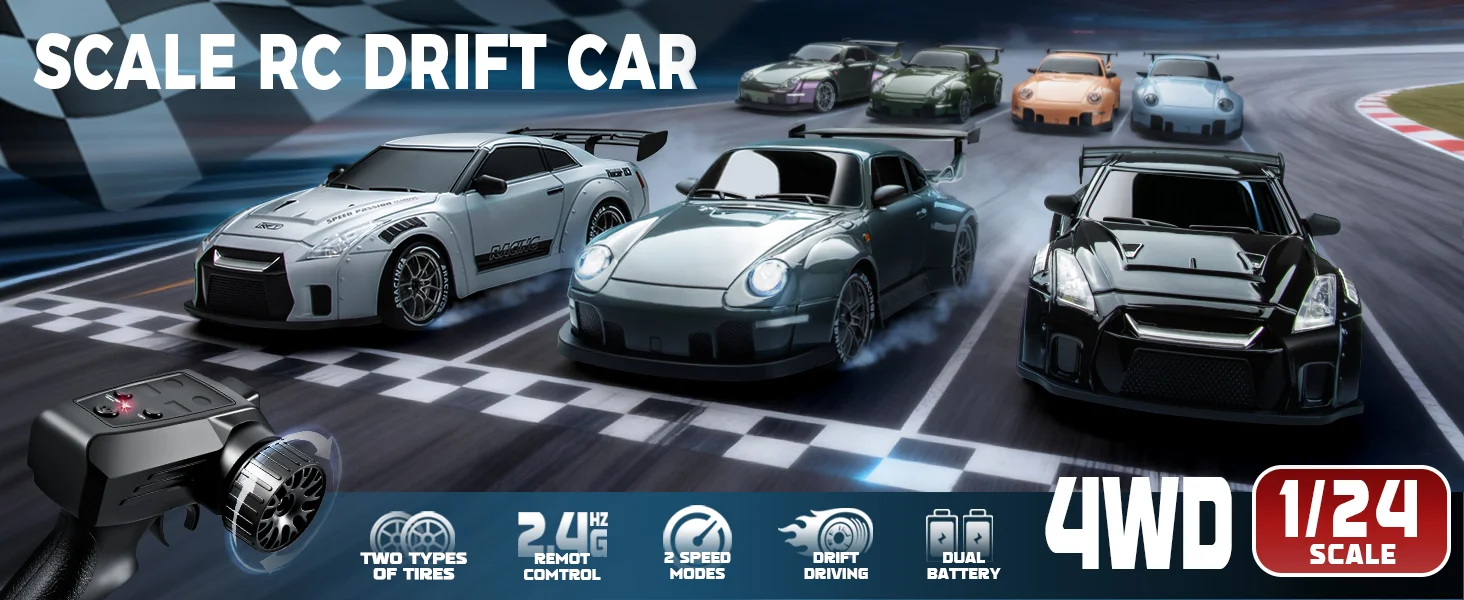 4WD RC Dirft Car: This 1:24 scale drift car combines classic model architecture with futuristic design elements. Featuring a high-toughness PVC body and streamlined silhouette, it integrates LED lighting system (Equipped with headlights and taillights) to enhance nighttime visibility while doubling as an artistic display piece when stationary.