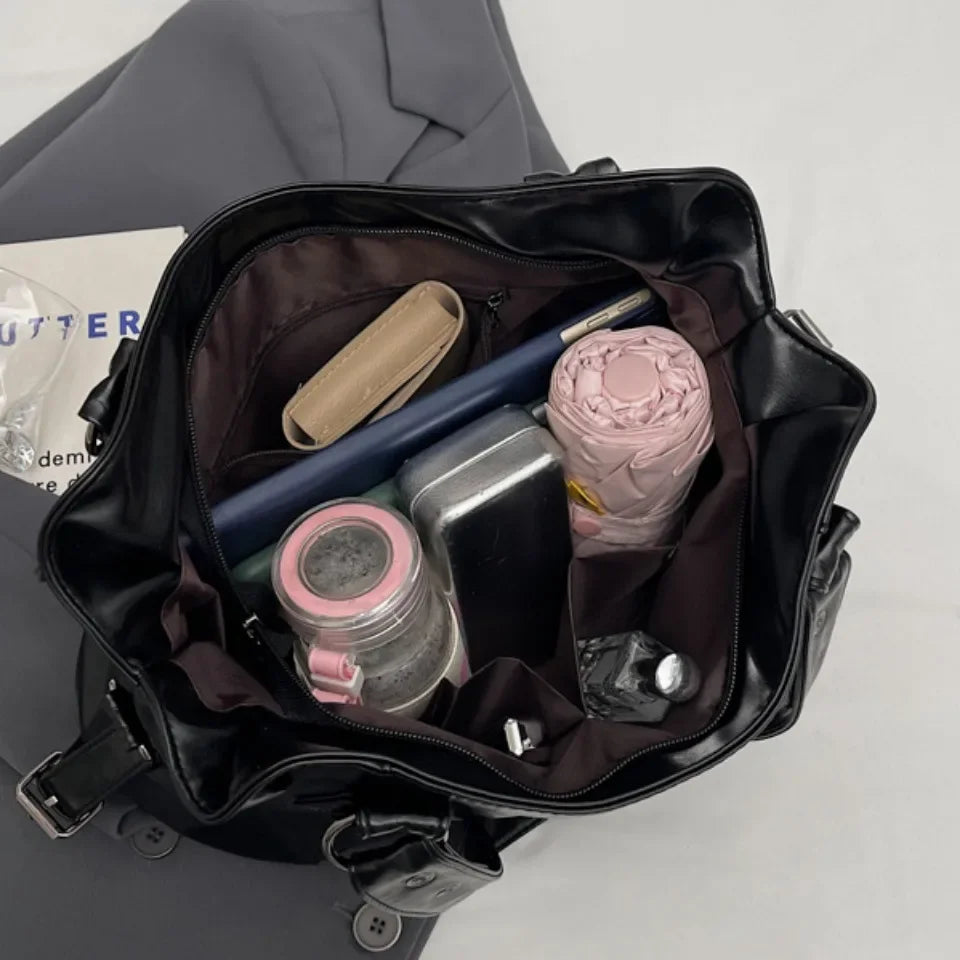 • Large capacity for daily essentials—wallet, phone, makeup, tablet, keys, etc.