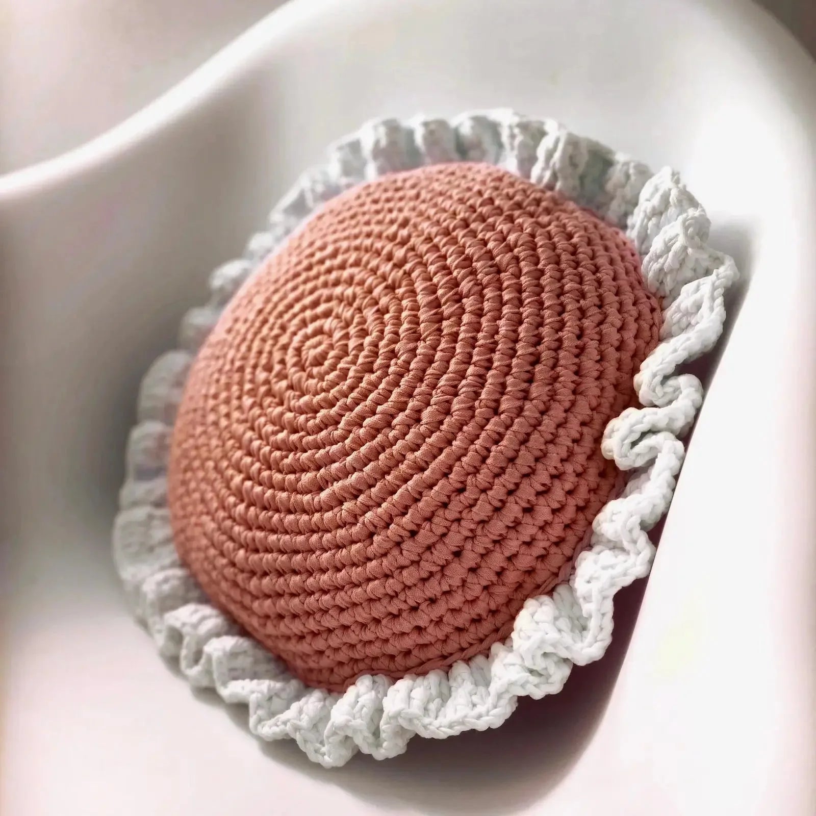 These round crochet pillows are made of recycled cotton, making it eco-friendly and totally unique. Measuring 16 inches in diameter (without frill) and featuring a ruffle in off white color, this lovely pillows comes in a variety of colors..
