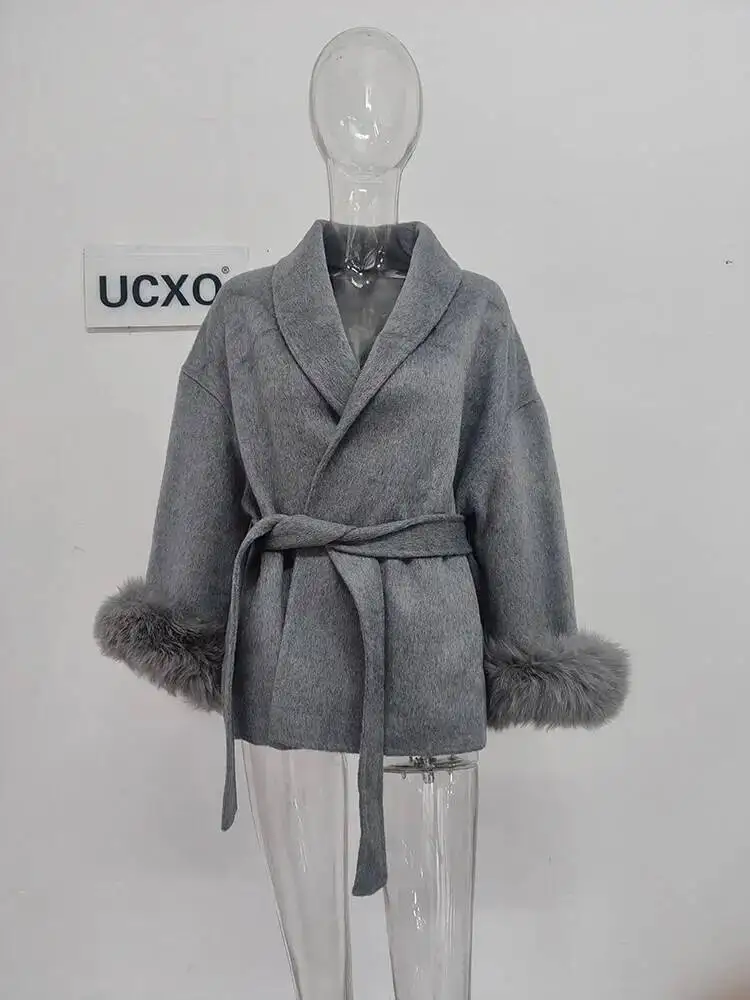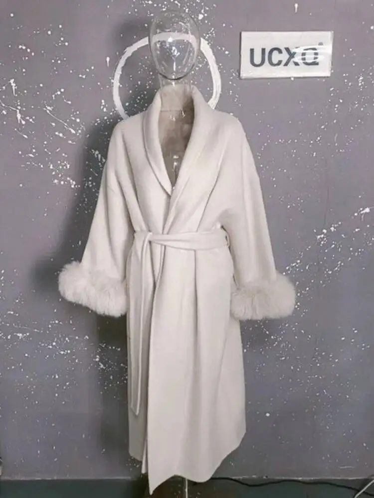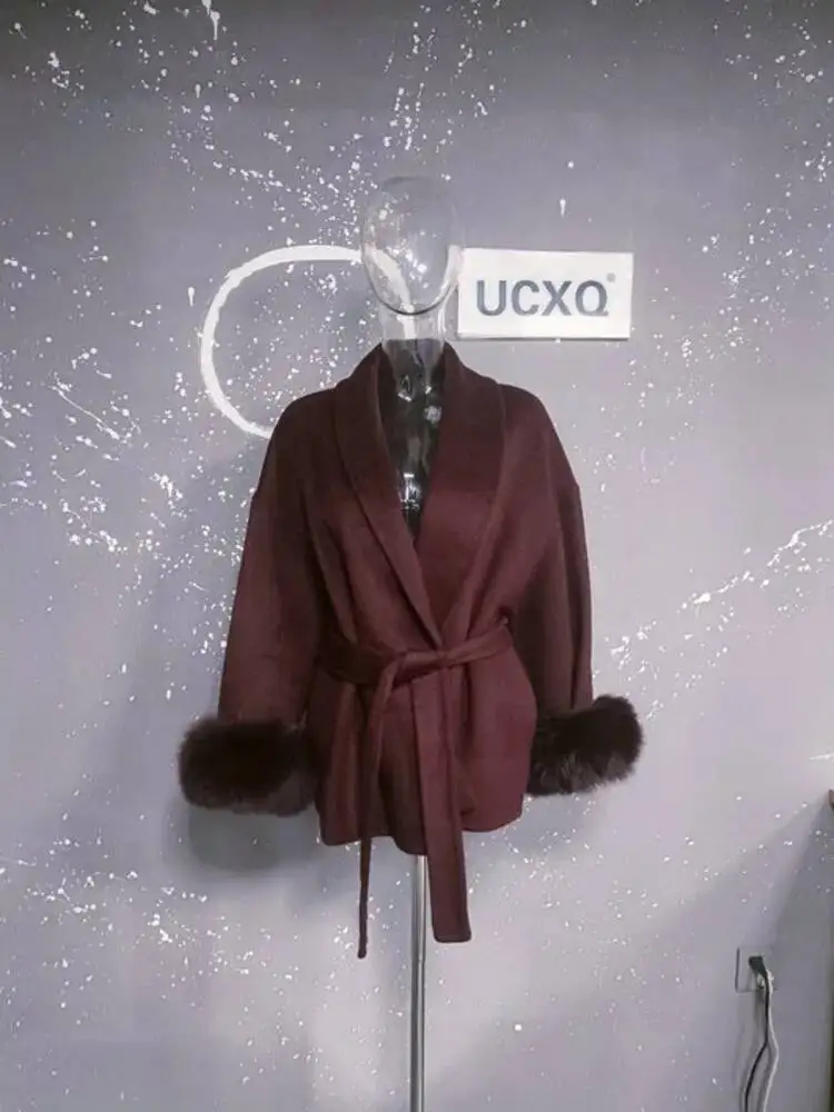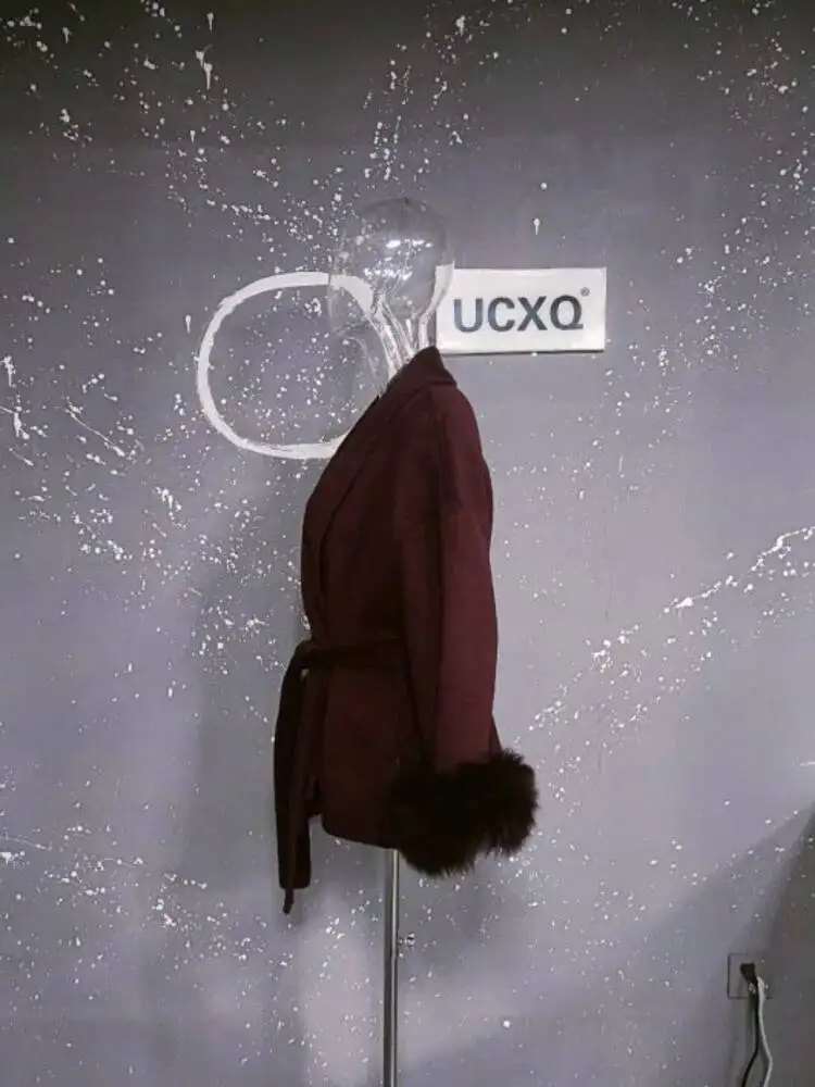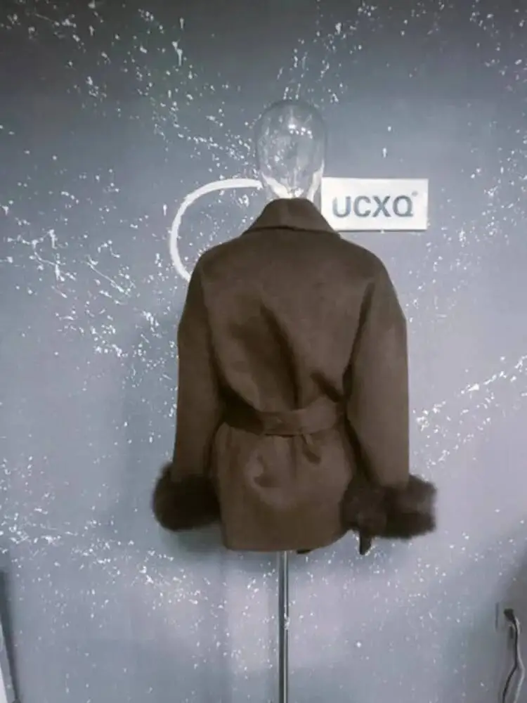 UCXQ Elegant OL Office Lady Overcoats Fur Patchwork Long Sleeve Woolen Coat Beautiful Women's Clothing Jacket Autumn 2025 Winter