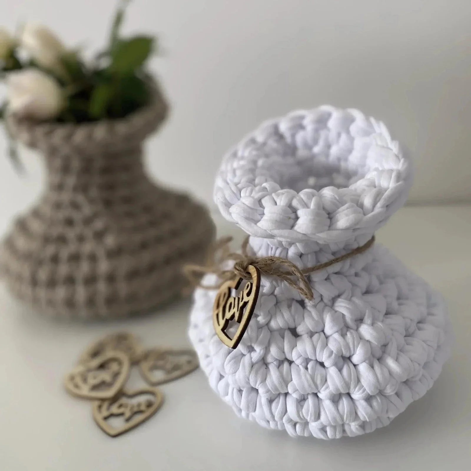 Add a charming, rustic touch to your home decor with this unique crochet vase! Handmade from recycled chunky cotton yarn, it'll make a one-of-a-kind mom gift, pencil holder, flower jar, or whatever creative idea comes to mind. Get ready for some cool crafting (and kudos!) in the form of this beige rustic jar!