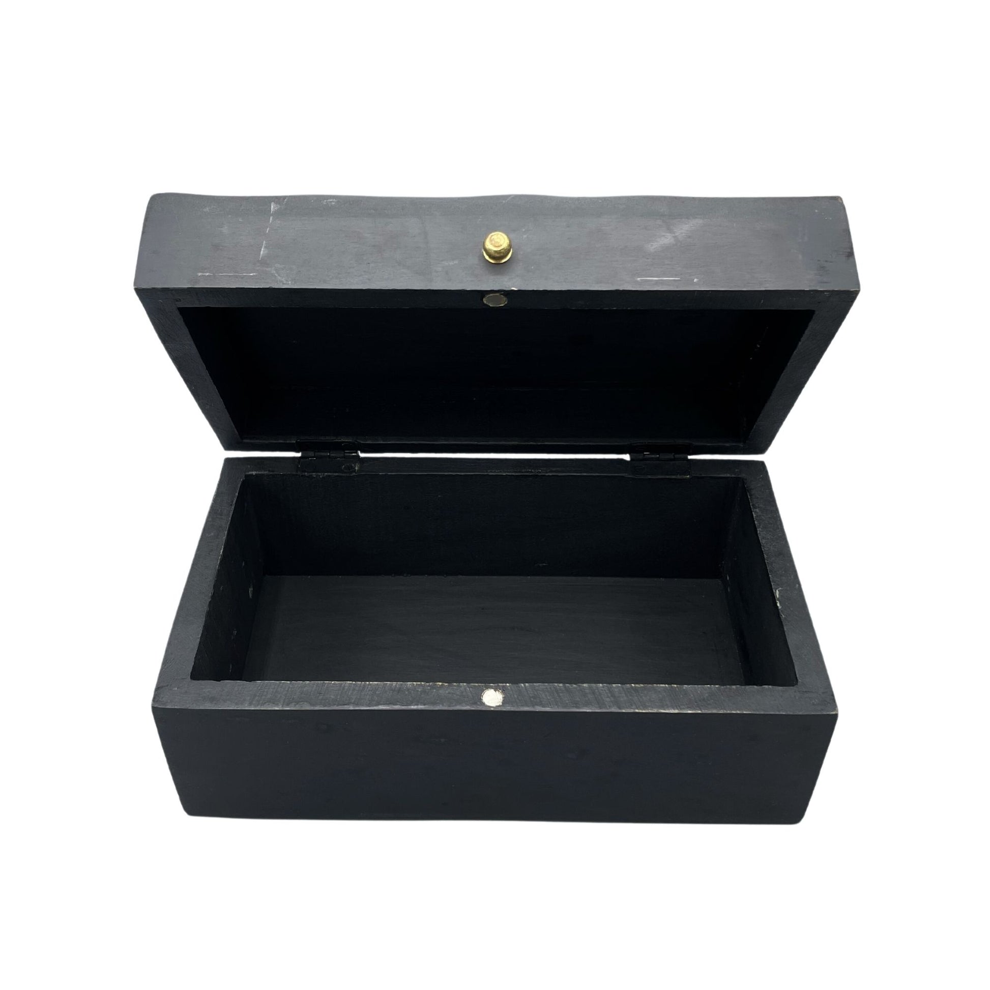 The all-black 22x12x10cm box boasts intricately engraved swirls on the lid, adding a touch of mystery and sophistication to your space.  The vintage-inspired design and lack colour make it a perfect addition to various décor styles.