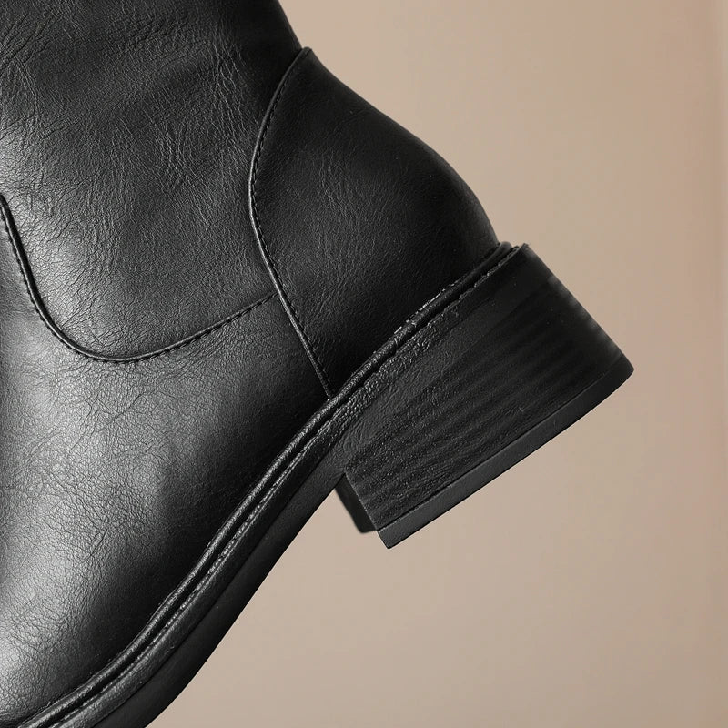 Women's New Autumn/Winter Genuine Leather Cowhide Mid Heel Large Metal Belt Buckle and Knee Zipper High Barrel Knight Boots