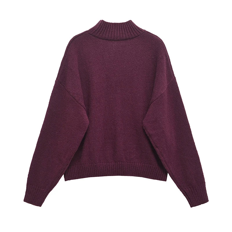 Women Burgundy Basic Knit Soft Sweater Vintage Oversize Turtleneck Long Sleeve