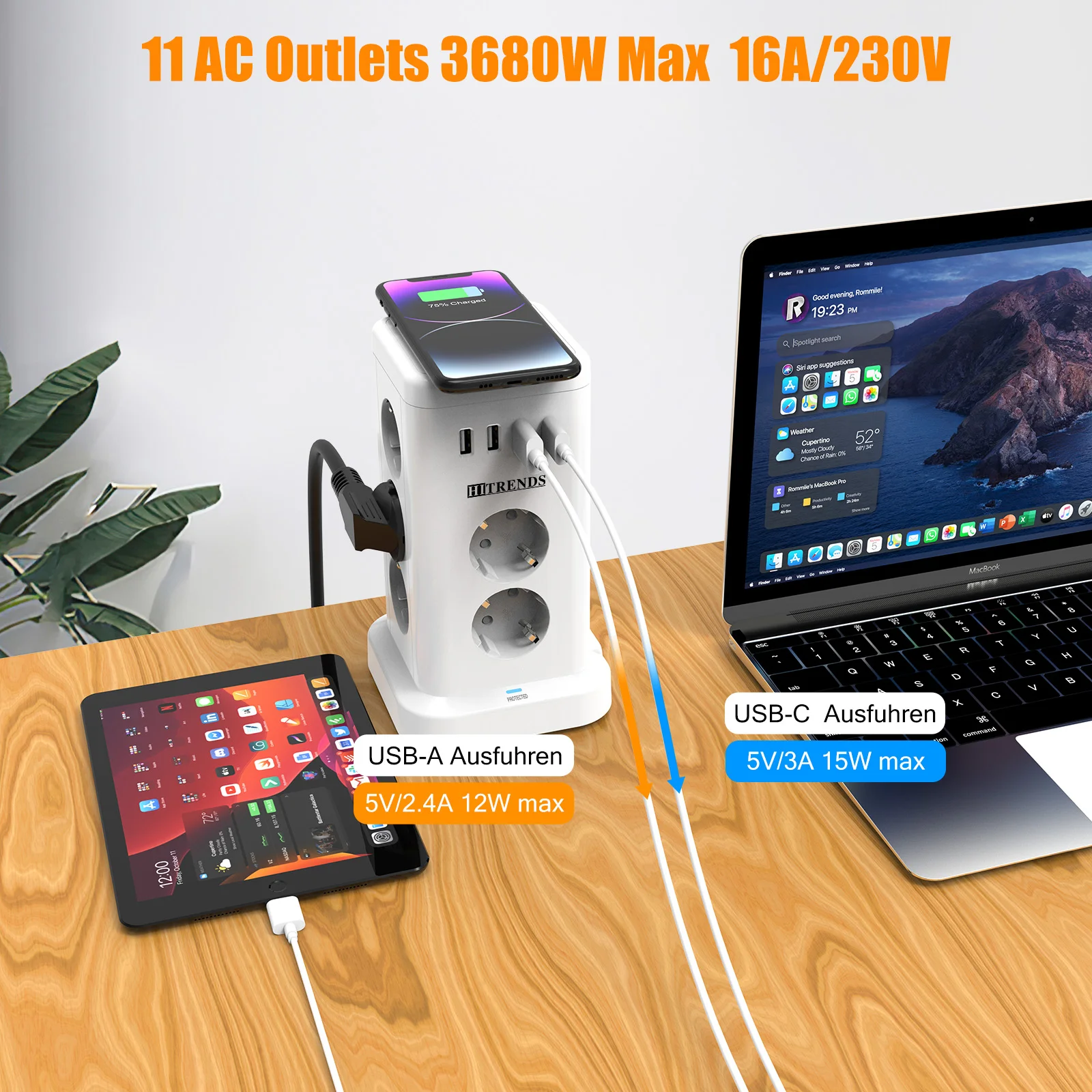 Placa de alimentação inteligente 15 em 1 com ficha padrão UE de 3680 W, tomada 7/11 CA, 3 portas de carregamento USB-A e 1 USB-C, cabo de extensão de 2 metros