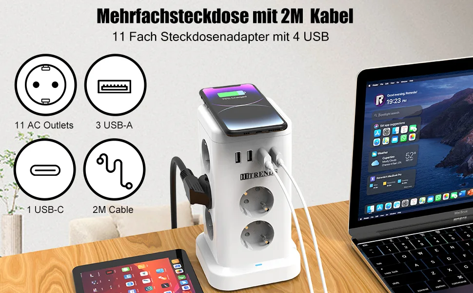 🔥 Tomada 7/11AC + 4USB de carregamento rápido, todos os dispositivos numa única ficha
