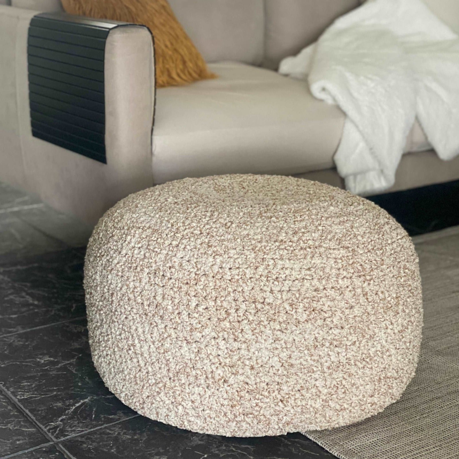 This unique neutral bouclé round pouf ottoman is beautifully handmade  from a thick boucle cotton yarn for a chunky and textured look.