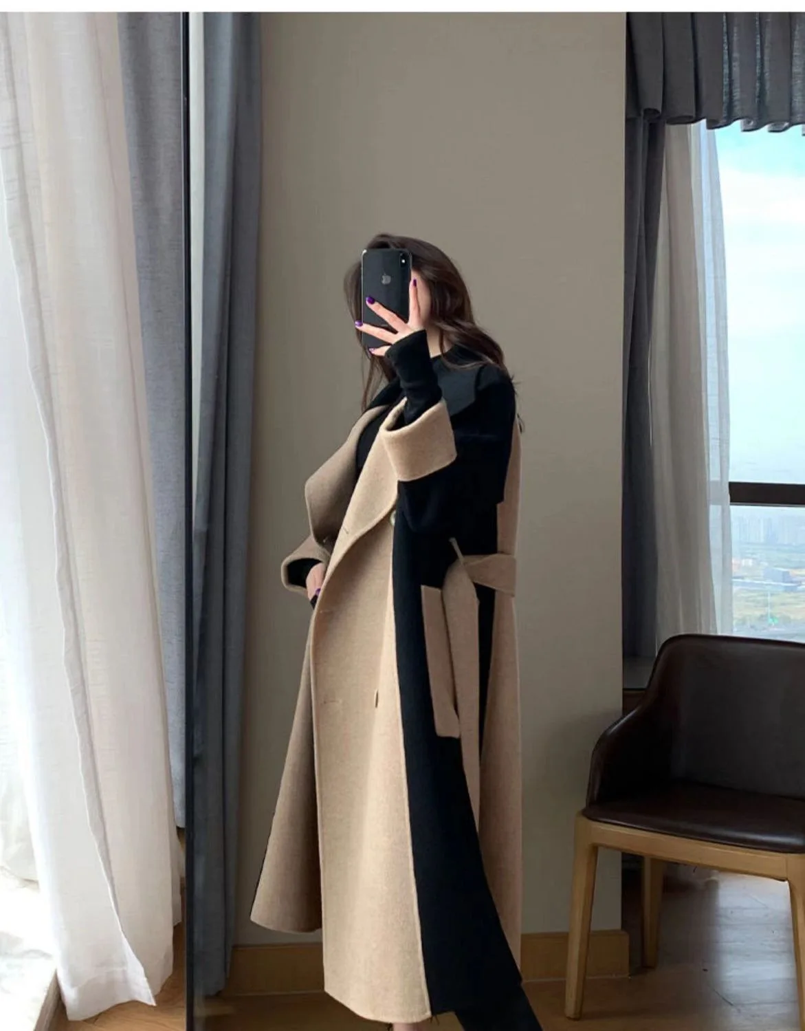 Winter New Color Block Slimming Hepburn Style Woolen Coat Women's Long Belted Gown Elegant Outerwear